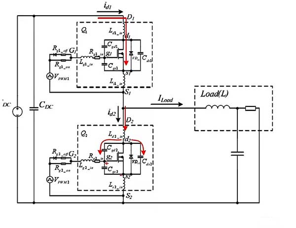 SiC MOS场效应管三相全桥逆变电路中,同一桥臂上下元件易受寄生参数的影响,互相产生干扰,即桥臂串扰。
